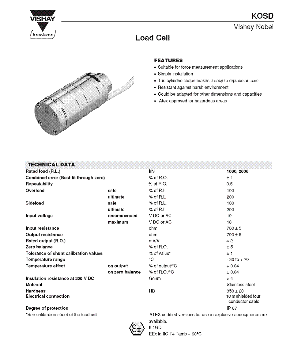 KOSD - 40稱重傳感器具有堅固的外殼,適合在惡劣環(huán)境中測力過載保護應(yīng)用。敏感元件包括三個部分,兩外部分構(gòu)成支持,中間部分是負(fù)載傳感的一部分。