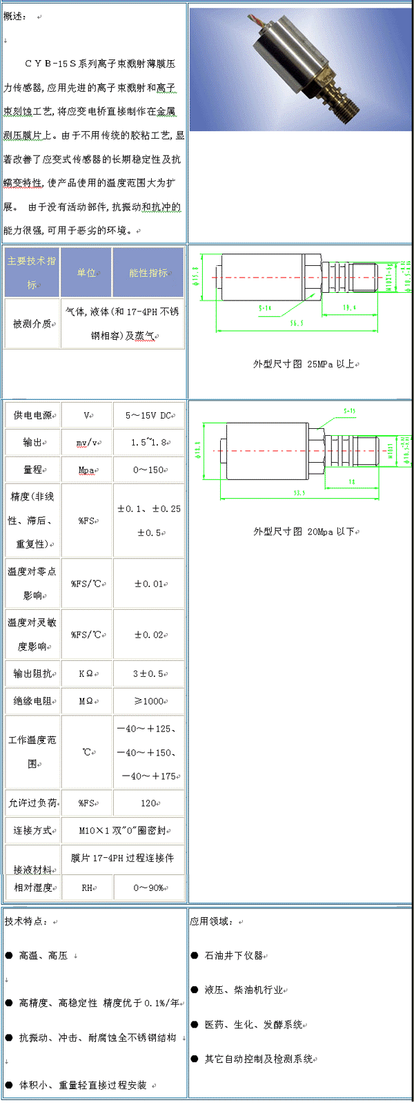 CYB-15S 濺射薄膜壓力傳感器(pressure sensor)